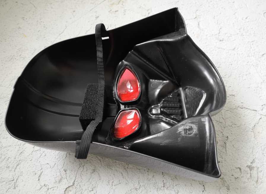 Маска виготовлена з чорного глянцевого пластику, має червоні лінзи, що додають образу загадковості.