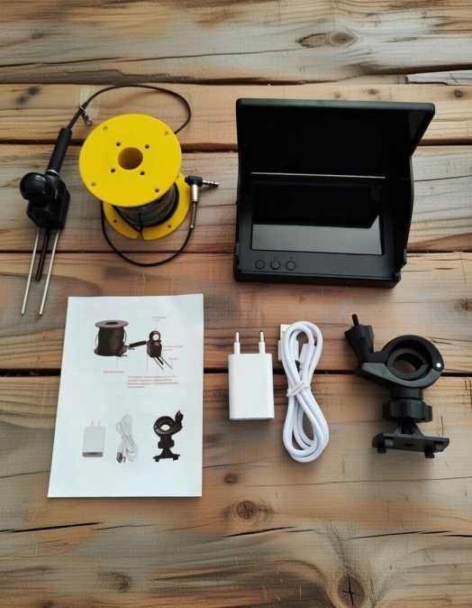 Монітор 4,3" з яскравістю 1000 лм, камера з 15-метровим кабелем, барабан для зручного зберігання кабелю, кронштейн для кріплення на вудилище, утримувач та поплавок для камери, зарядний пристрій, інструкція.