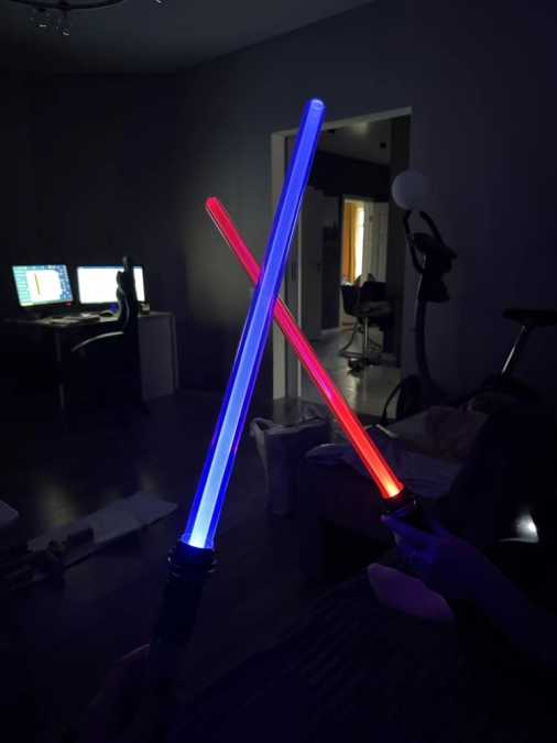 Характерное гудение при включении, свист при взмахах, треск при столкновении. Звуковые эффекты качественные, не пищат и не хрипят. Именно те звуки, которые должны быть. Громкость нормальная — слышно хорошо, но соседей не разбудите.